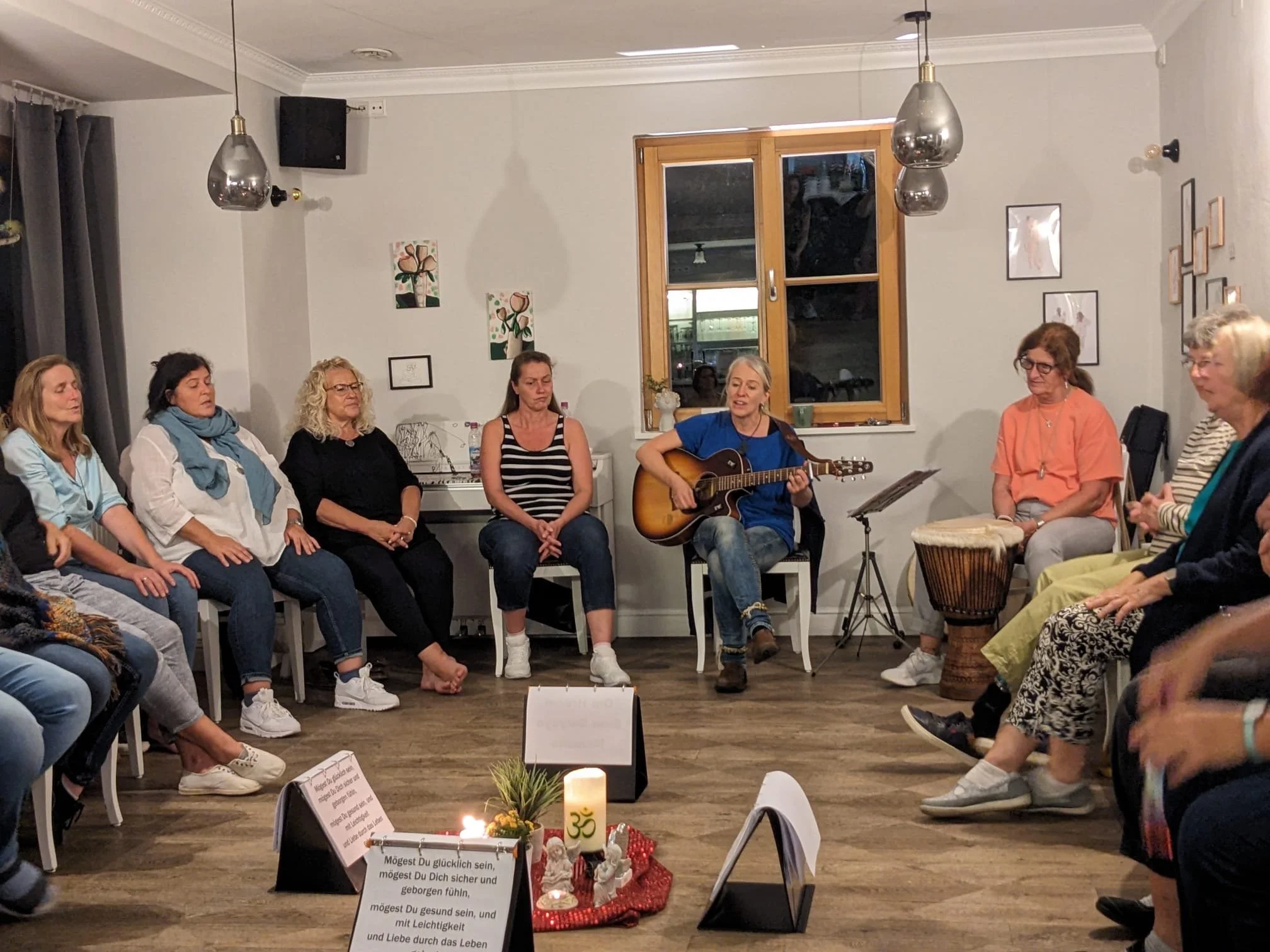 Anke spielt das Lied erst Mal auf ihrer Gitarre vor, dann singt sie dazu....und wir alle stimmen Stück für Stück mit ein...so einfach und wunderbar leicht.